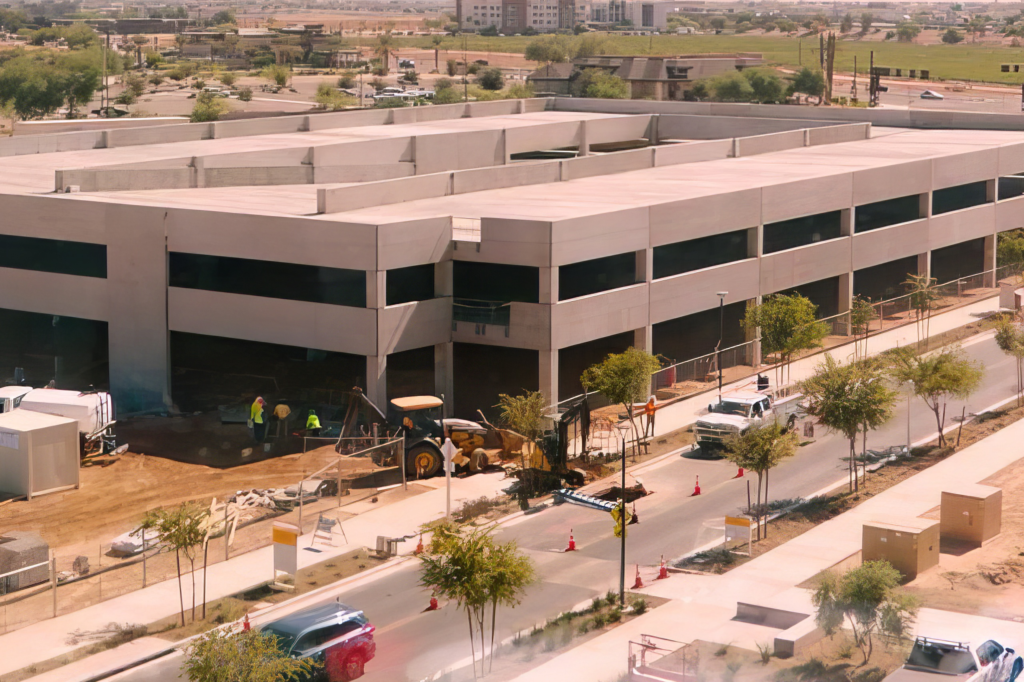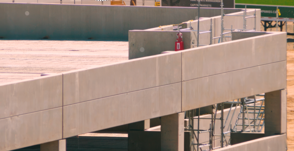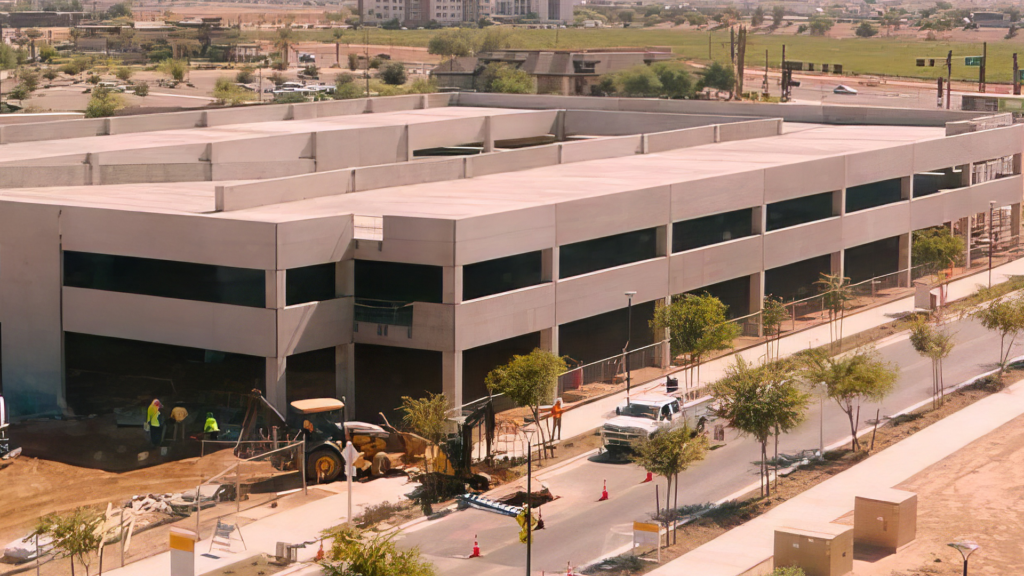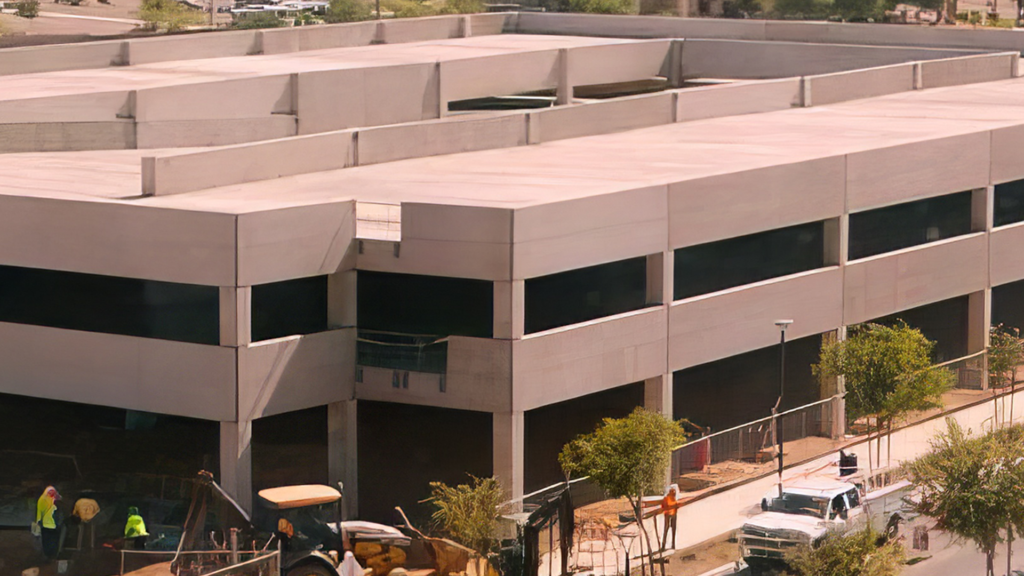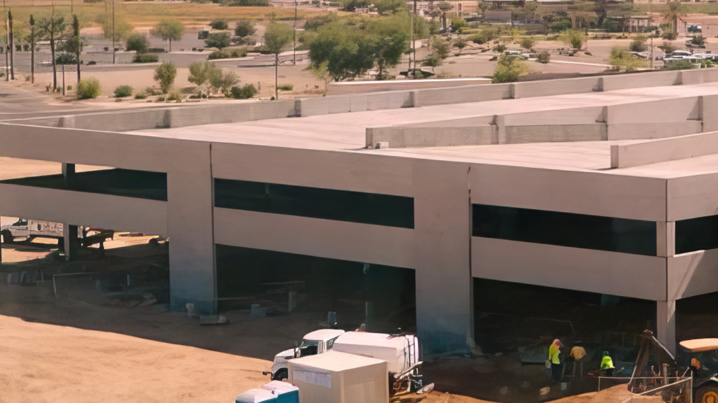 The project includes a three-level (2 supported) open-air garage with a total of 525 stalls and an elevated deck area of 105,500 sf. The construction involved the use of 308 precast pieces and the transportation of 265 loads. The entire structure was erected within a span of 19 days. It is a structural parking garage featuring 12′ wide double tees, beams, columns, precast shear walls, and exterior spandrels. The exterior finish was achieved with a smooth form grey surface that will be painted.